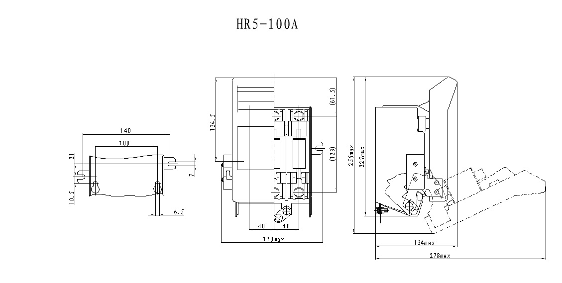 本系列开关由三极底座、带嵌入式灭弧罩的上插座、下插座和可拆卸的盖组成,盖兼作手柄并在其背面卡装熔断体。更换熔断体时可将盖  从底座上卸下,以防触及带电部件。底座两侧的片状弹簧使开关具有快  速分、合功能。