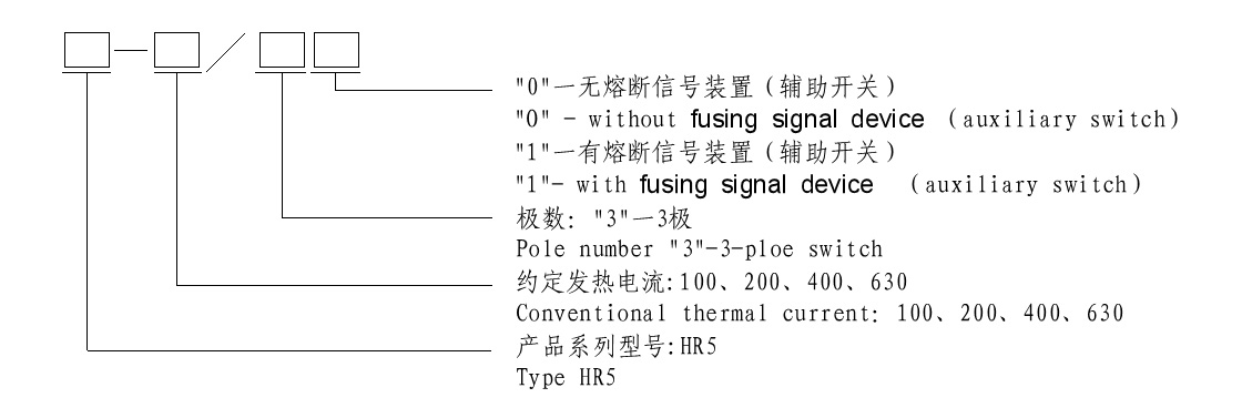 Series HR5 fuse-switch-disconnector with rated voltage up to 50Hz  380V and rated current up to 630A is applicable to the distribution circuit  and motor circuits with high short-circuit currents as the power switch,  switch-disconnector and emergency switch for protection purpose  Generally it is not suitable for directly operating a single motor. HR5 fuse-  switch-disconnector is composed of a triple-pole base, upper socket set  with built-in arc chute, lower socket set and removable cover. The cover  also functions as a handle and the fuse-links are fitted to its back. When  replacing fuse-link, the cover can be removed from the base to avoid  touching to live parts. The sheet springs on both sides of the base equip the  switch with fast making breaking function.